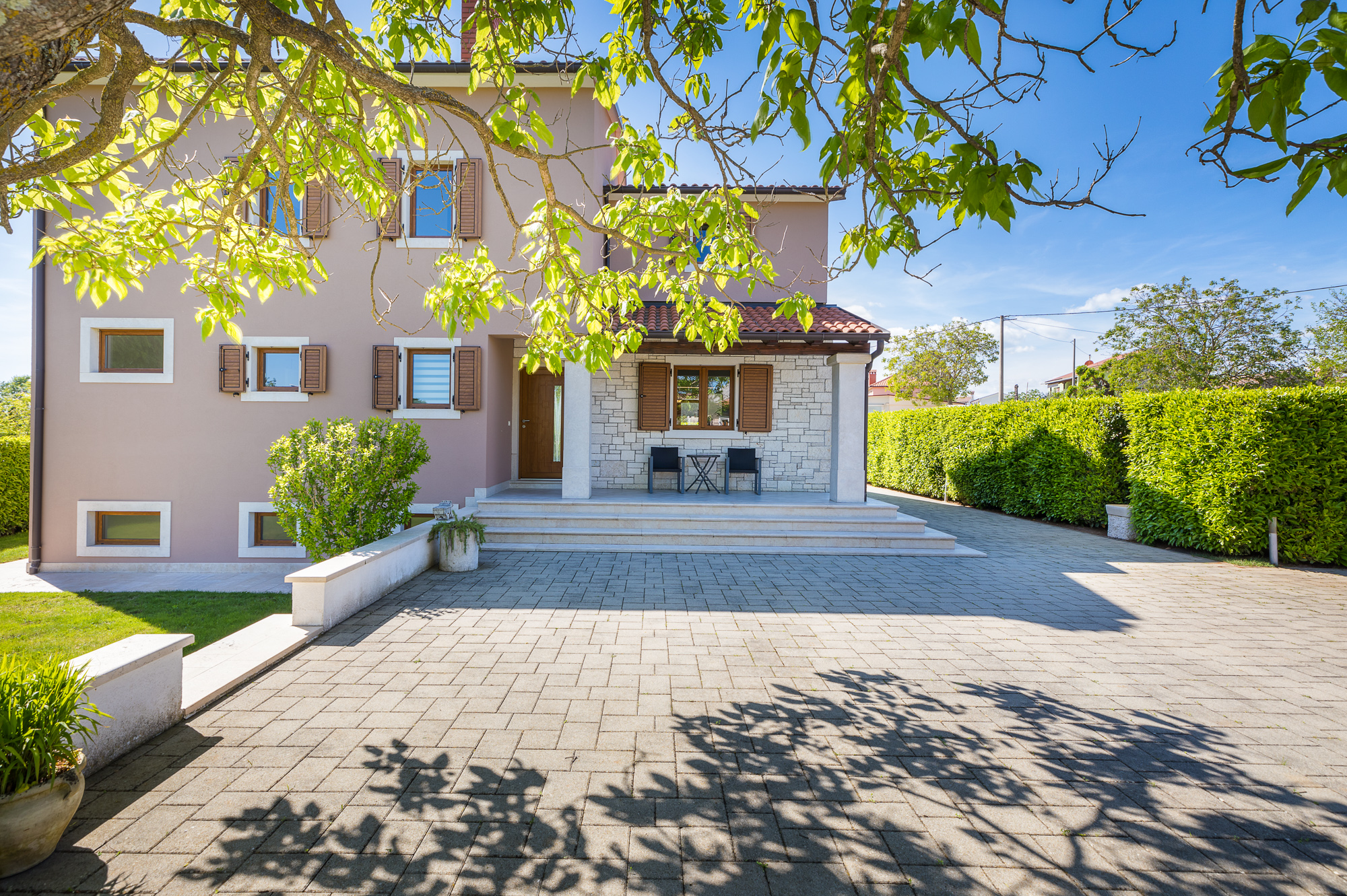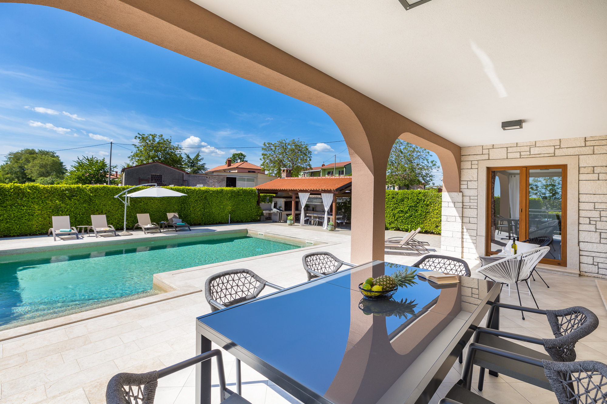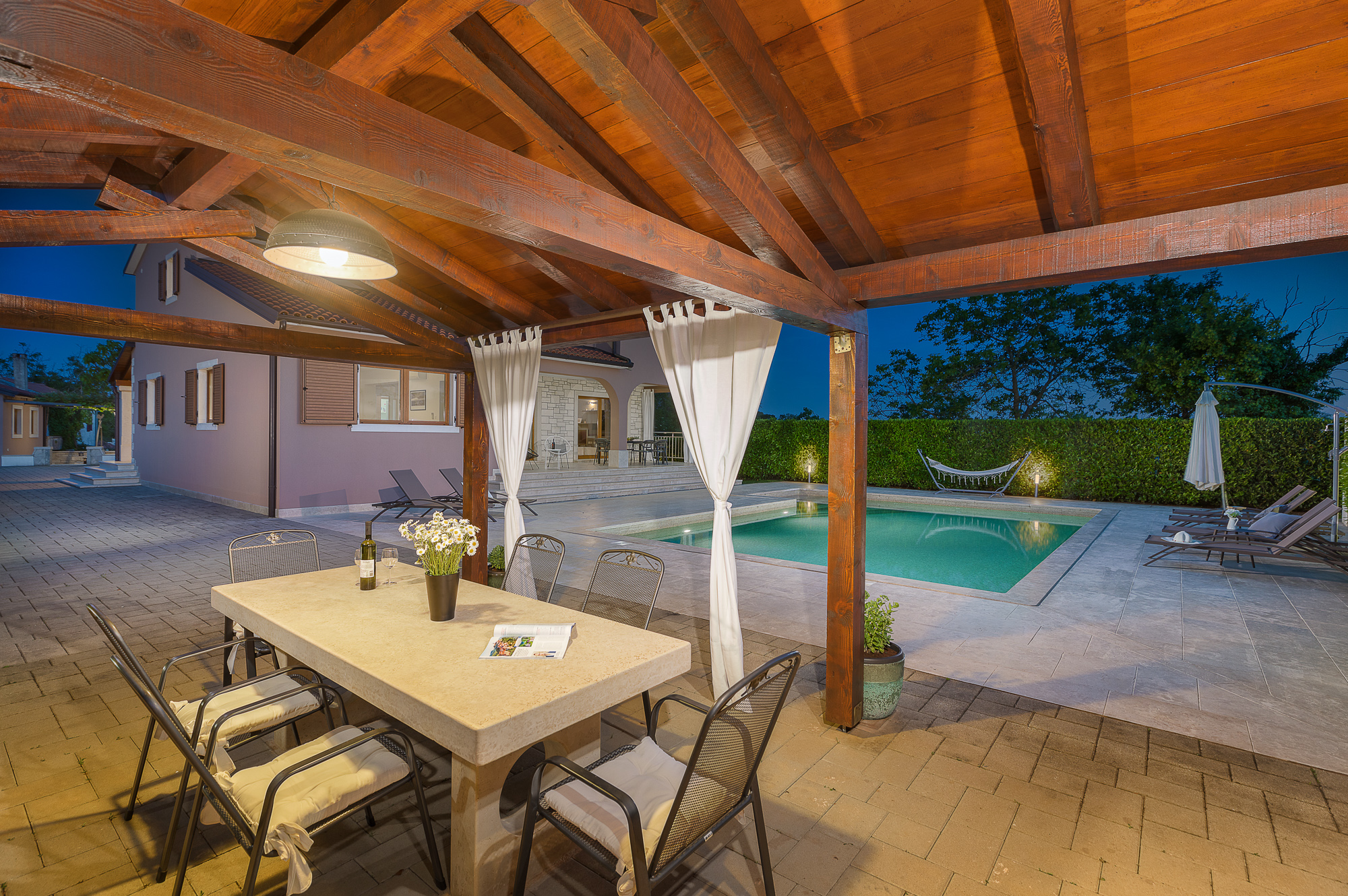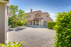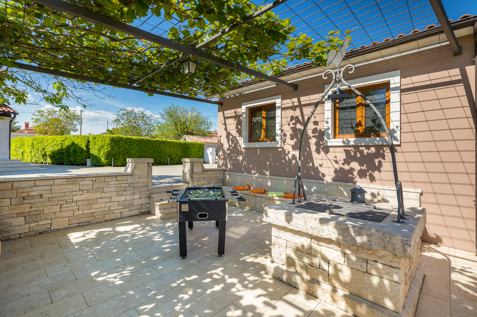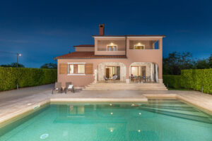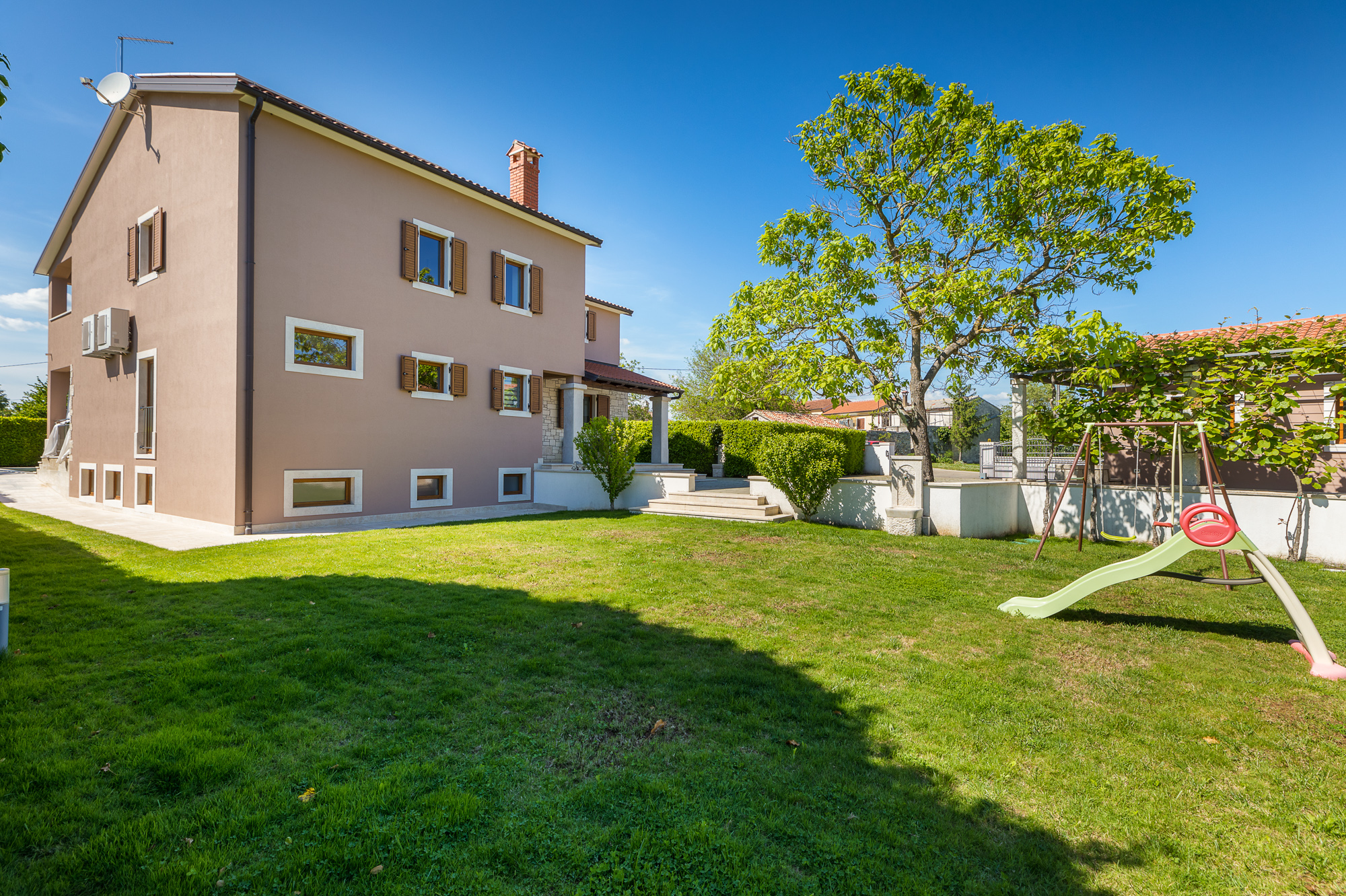 This beautiful comfortable family house “Villa Anastasia” is suitable for children; it’s 2 storey house. The villa is located in central Istria in Sveti Petar u Sumi. The 228 m2 interior offers a large living room and a fully equipped kitchen with an open-plan dining area. The entrance leads directly to the terrace with a large, private pool (6 x 10m), stone and gas grill and outdoor dining table. On the first floor of Villa Anastasia there are 3 bedrooms with private bathrooms for 6 guests. The completely enclosed and fenced garden offers enough space for a relaxing holiday, whether you want to enjoy the sun and swim in the private pool or relax on the terrace with a glass of Istrian Malvasia wine. The large lawn equipped with an irrigation system is an ideal place for children to play on the slide, swing and seesaw, and in the yard you can play basketball, darts or table football. Villa Anastasia in central Istria, is the ideal holiday home for your perfect vacation in the heart of the Croatian peninsula. There is also a parking space for 2 cars in the garage.