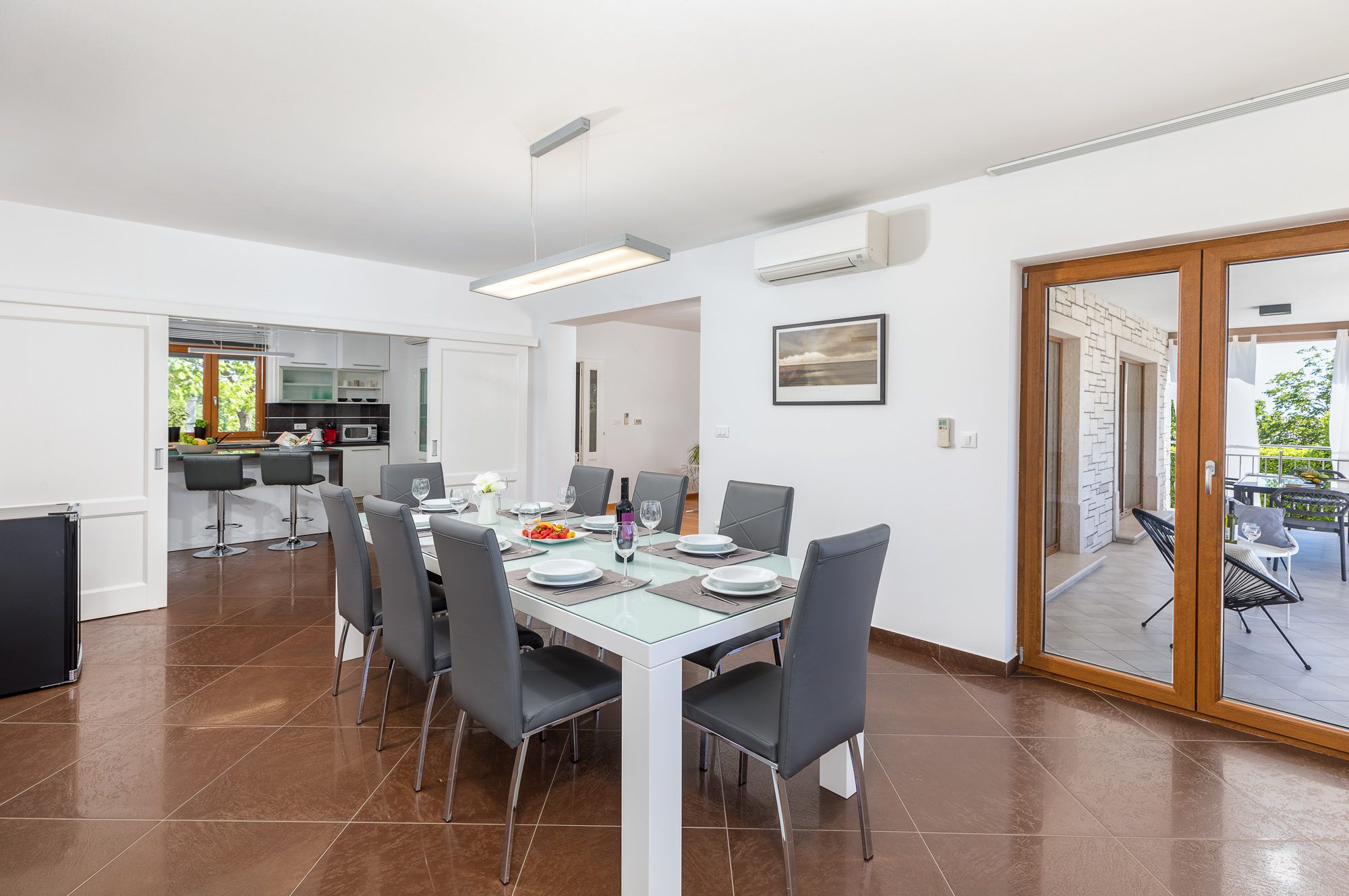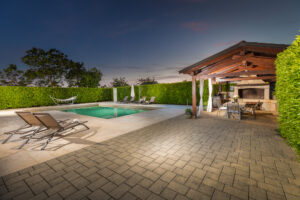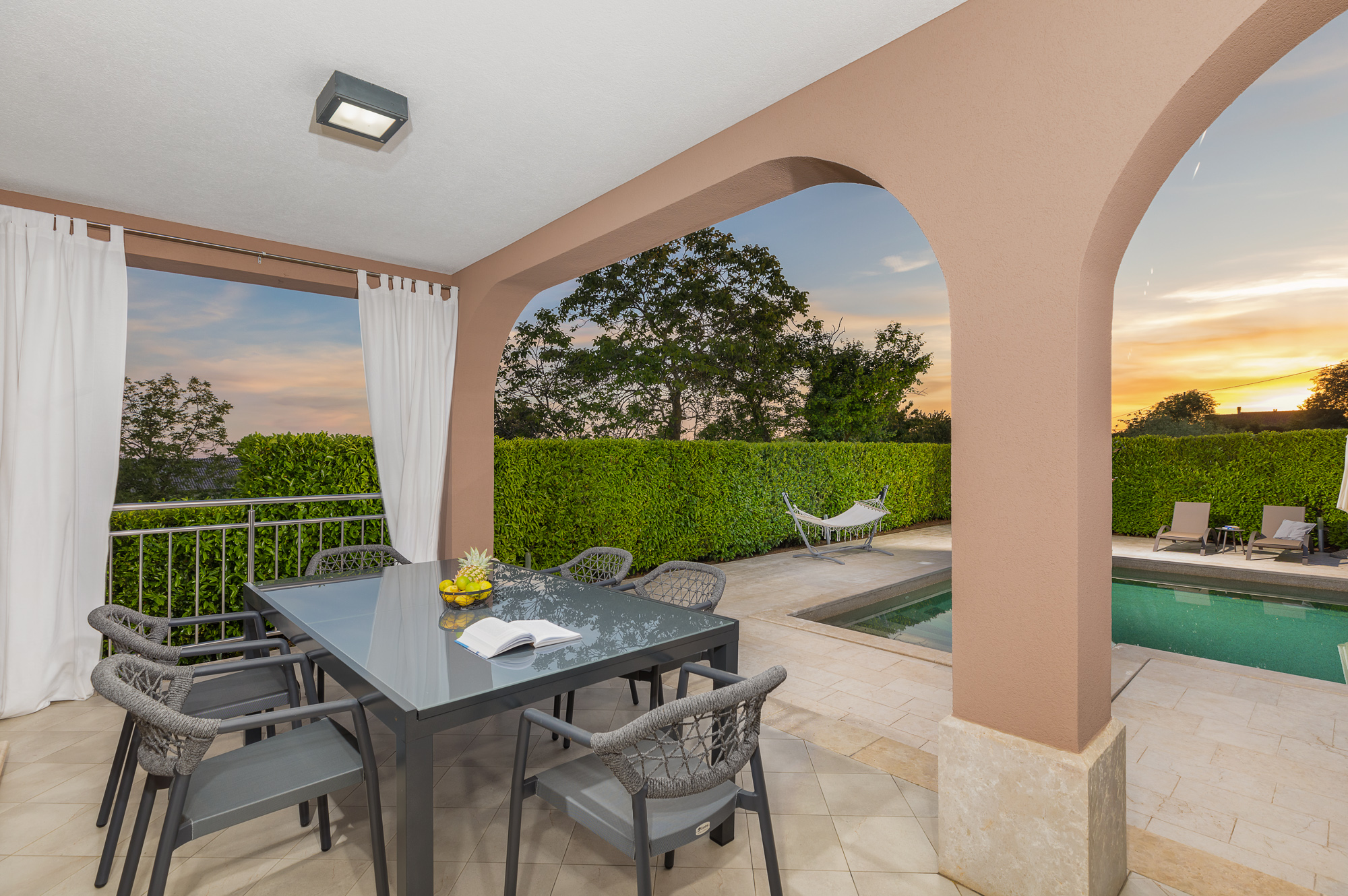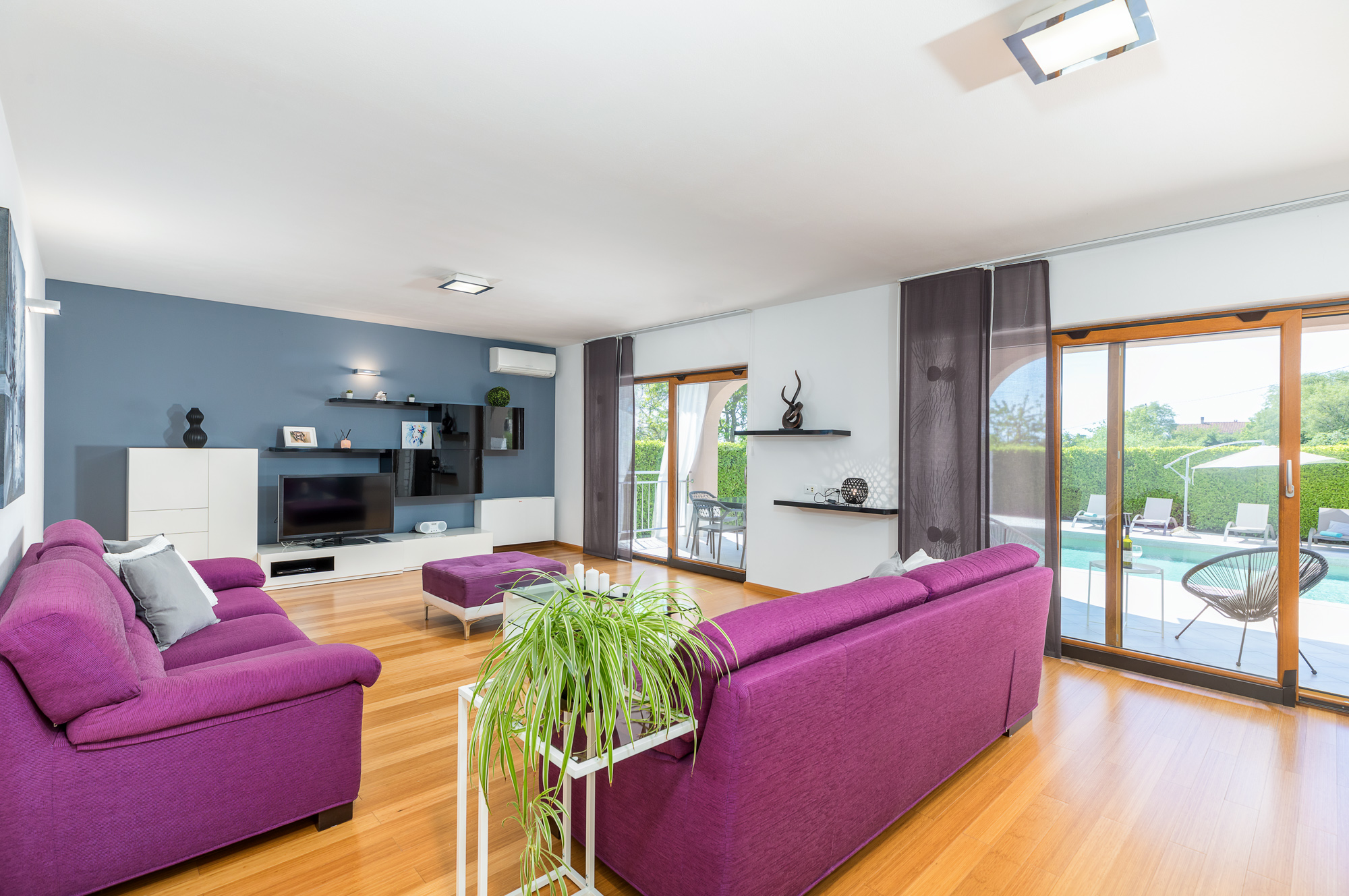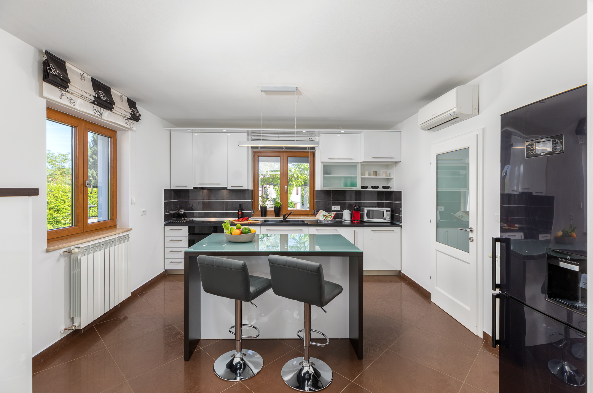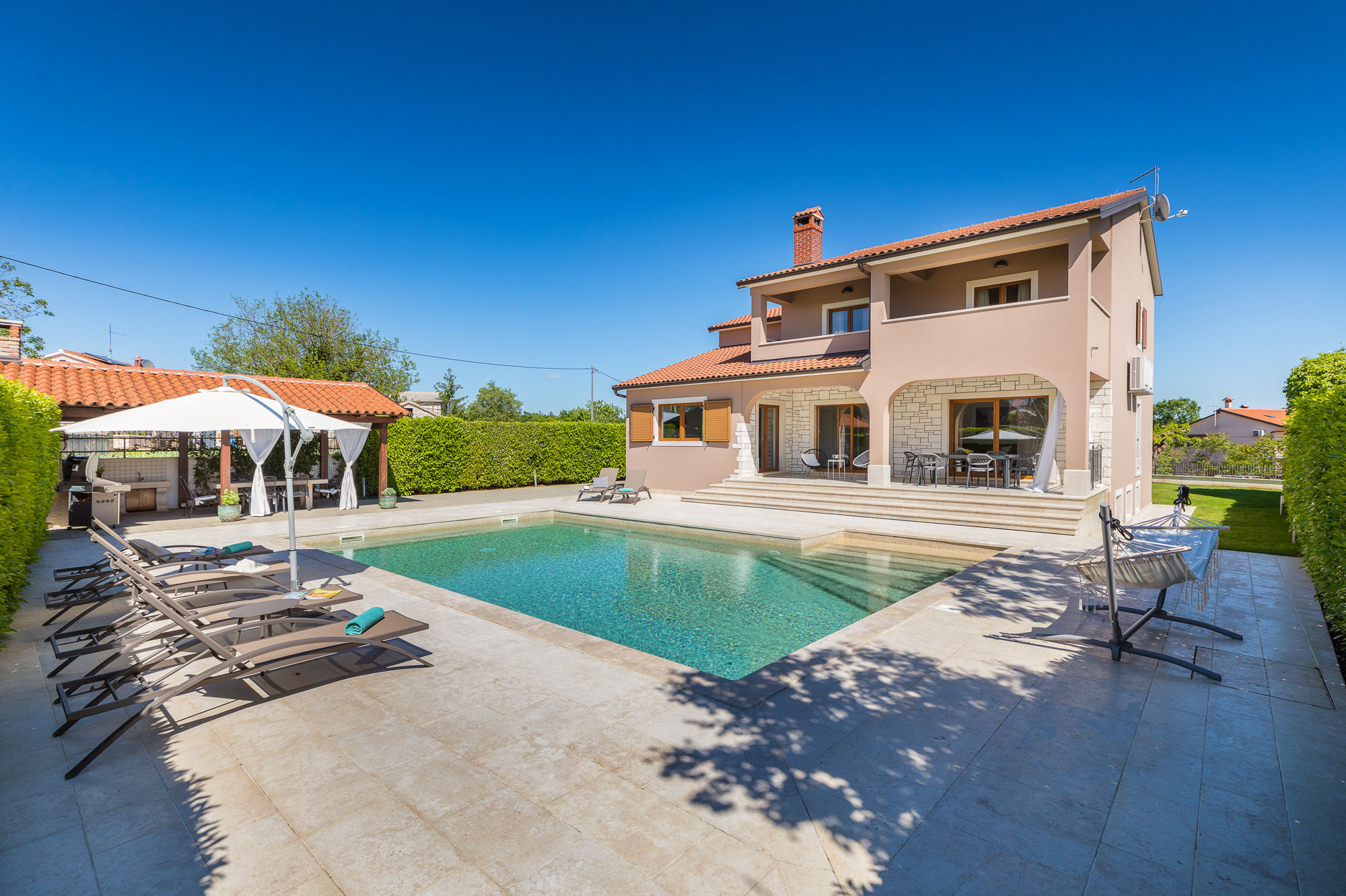 This beautiful comfortable family house “Villa Anastasia” is suitable for children; it’s 2 storey house. The villa is located in central Istria in Sveti Petar u Sumi. The 228 m2 interior offers a large living room and a fully equipped kitchen with an open-plan dining area. The entrance leads directly to the terrace with a large, private pool (6 x 10m), stone and gas grill and outdoor dining table. On the first floor of Villa Anastasia there are 3 bedrooms with private bathrooms for 6 guests. The completely enclosed and fenced garden offers enough space for a relaxing holiday, whether you want to enjoy the sun and swim in the private pool or relax on the terrace with a glass of Istrian Malvasia wine. The large lawn equipped with an irrigation system is an ideal place for children to play on the slide, swing and seesaw, and in the yard you can play basketball, darts or table football. Villa Anastasia in central Istria, is the ideal holiday home for your perfect vacation in the heart of the Croatian peninsula. There is also a parking space for 2 cars in the garage.