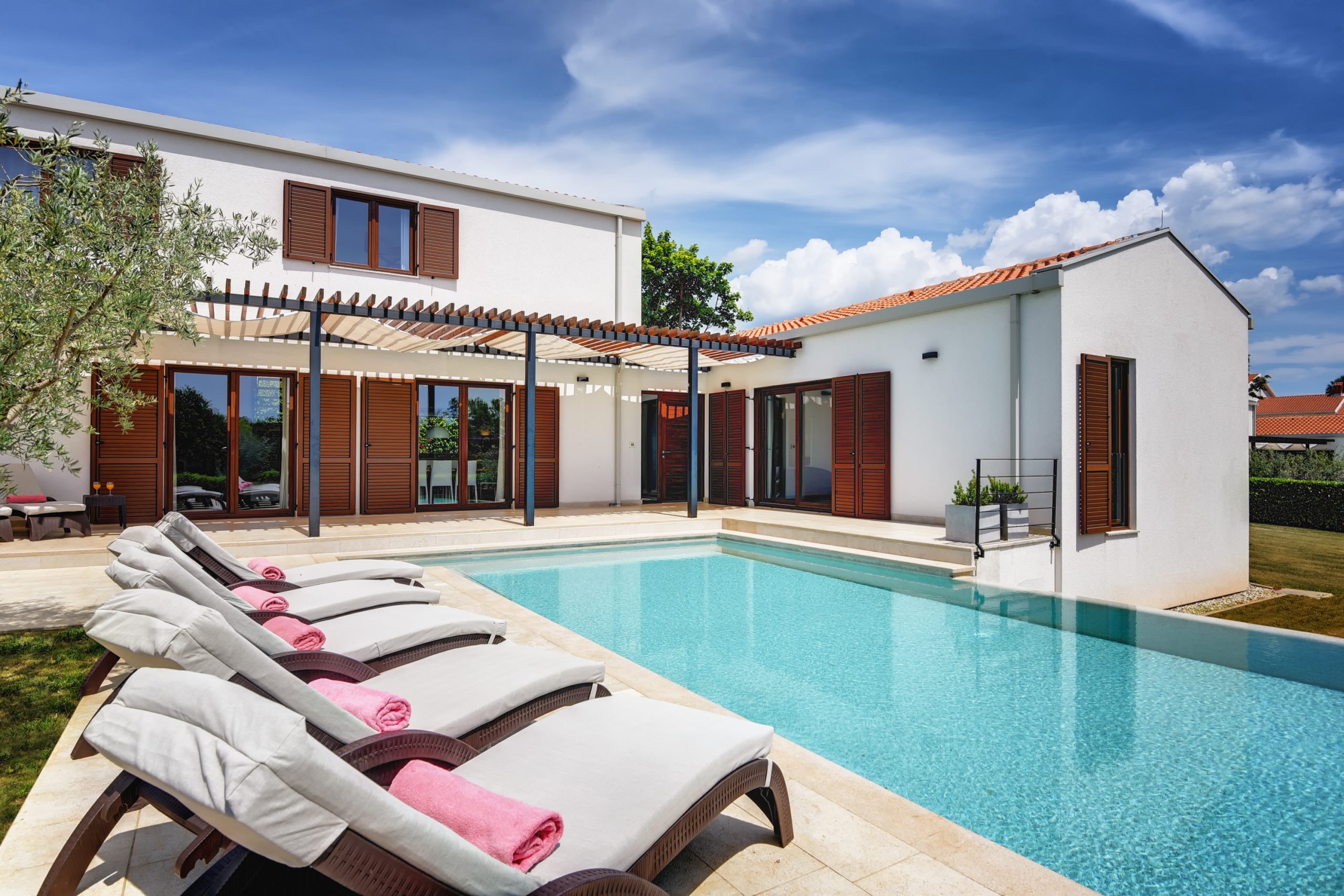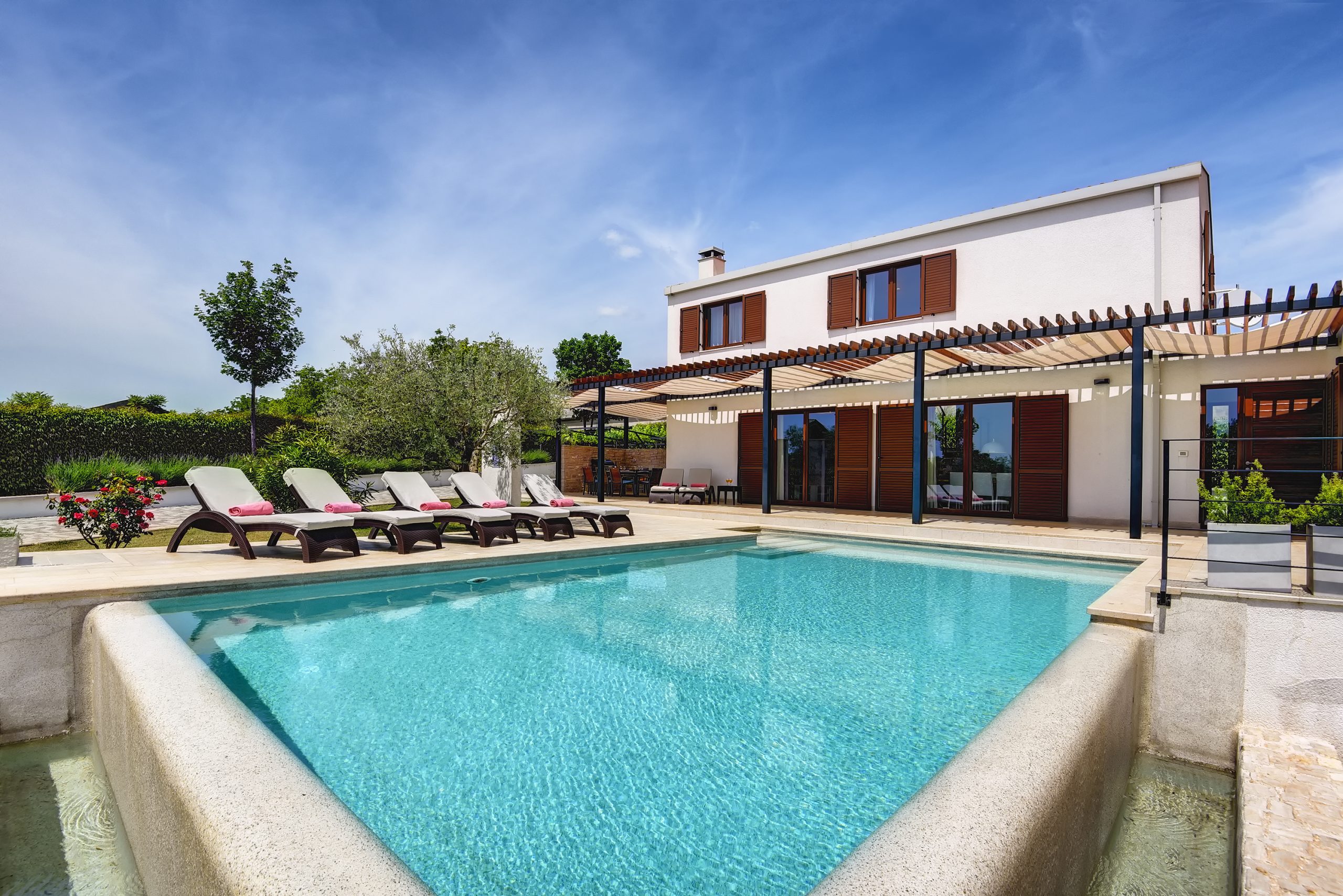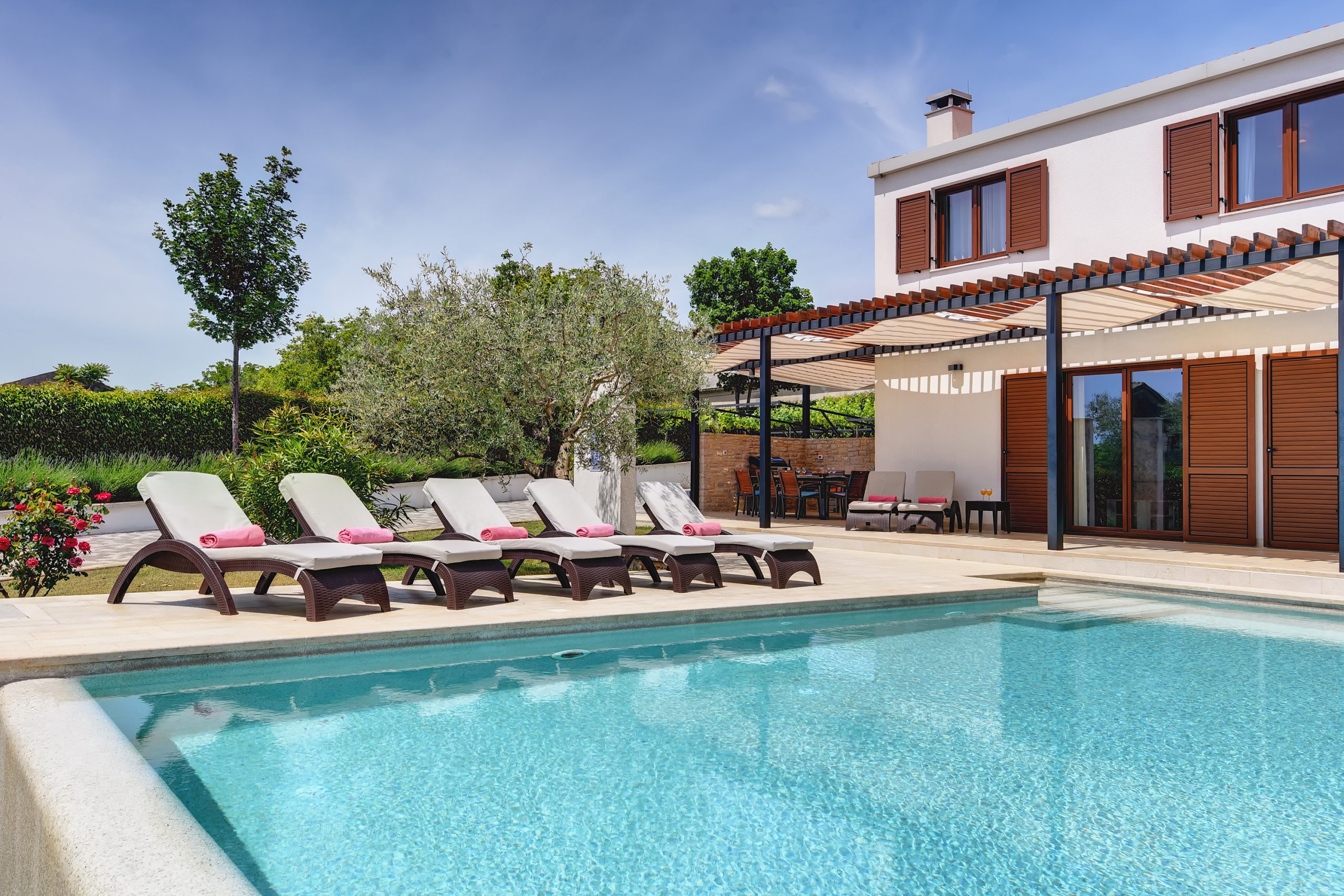 The beautiful and large Infinity pool, surrounded by a big charming green lawn, offers a perfect escape from stress. Here you can relax, swim, sunbath and enjoy your holiday. Prepare delicious meals for your family or friends on the outdoor gas grill or on the coals and dine outside in an al-fresco dining area. At your disposal are a beautiful and spacious living room, a kitchen and 3 bedrooms with en suite bathrooms. One of the bedrooms is connected to another bedroom with additional bed.