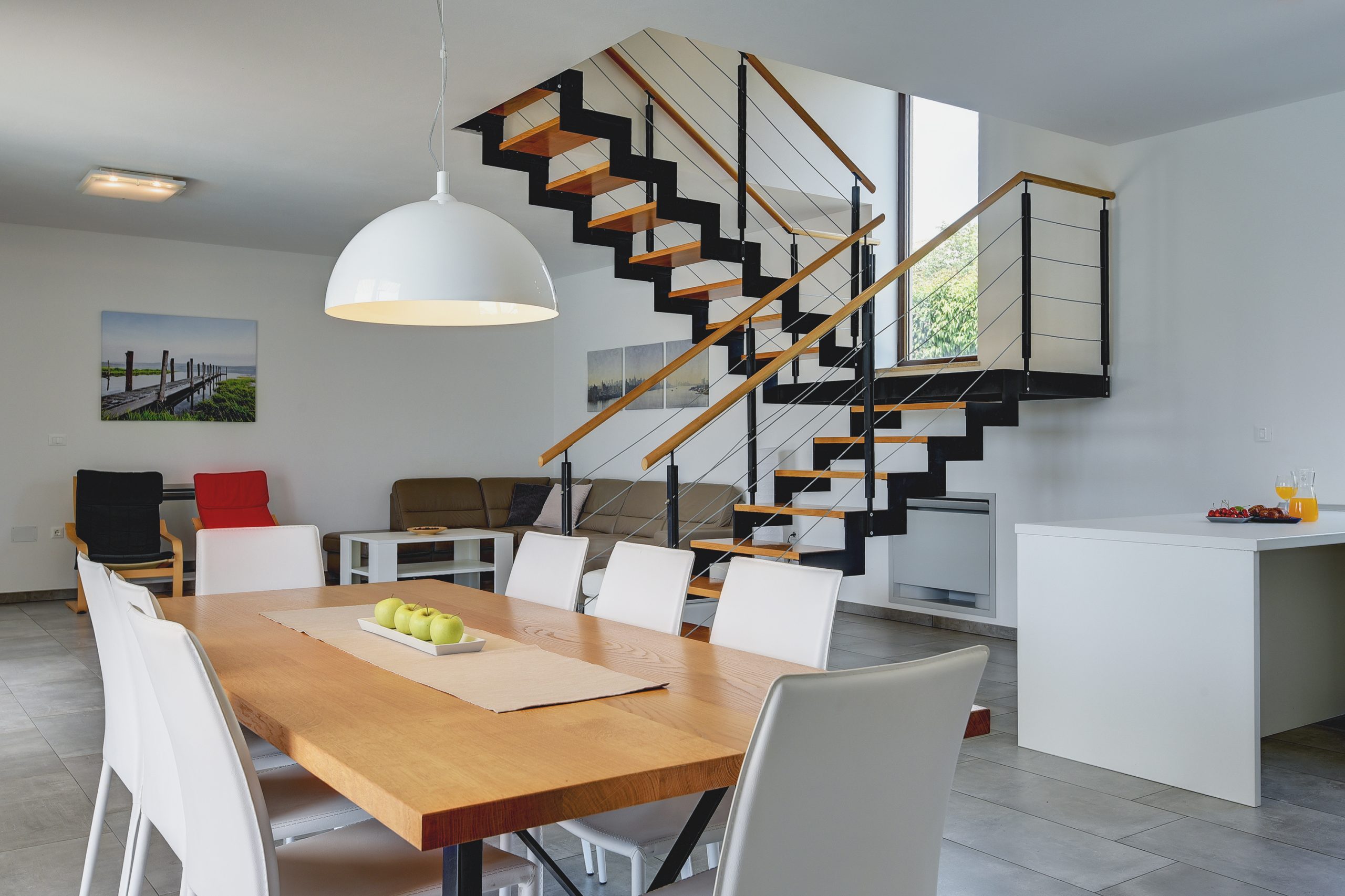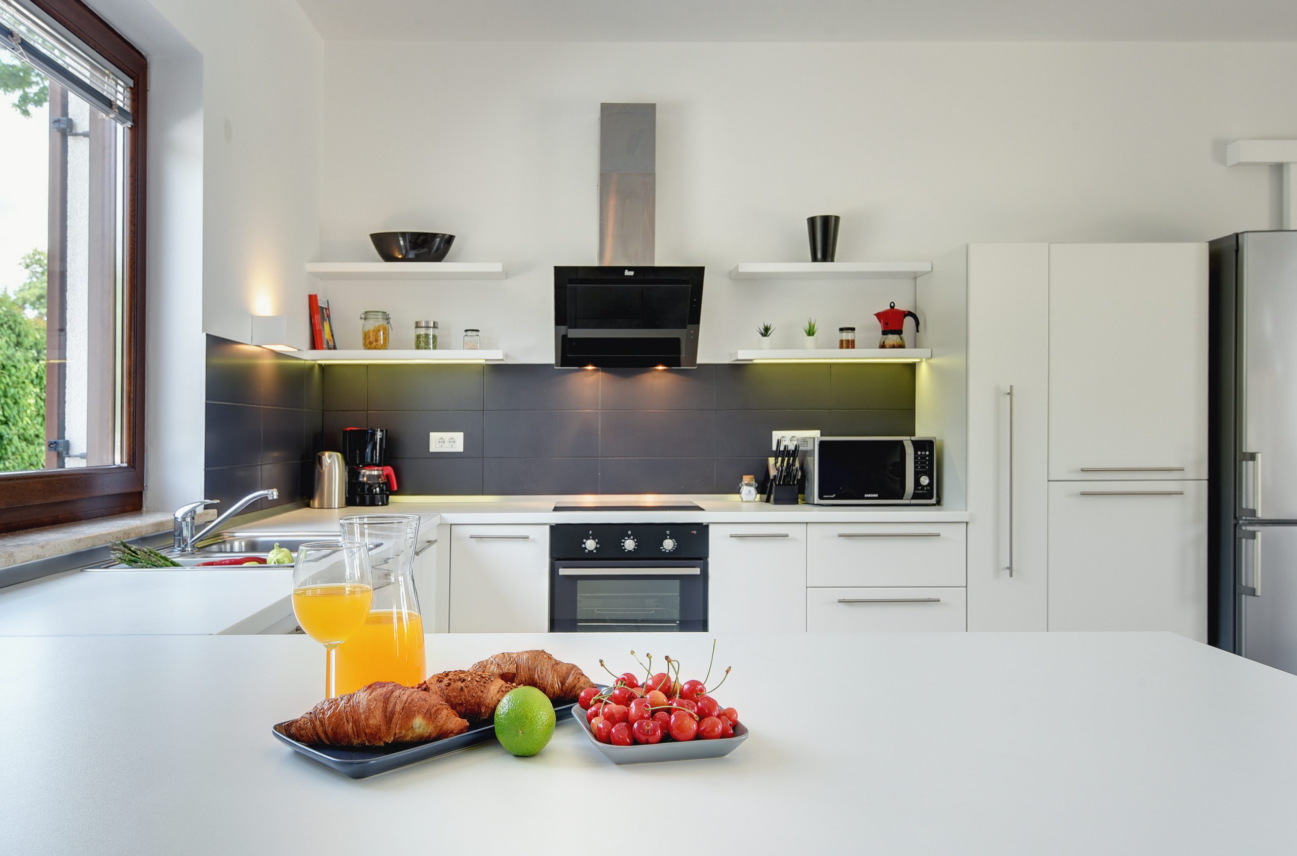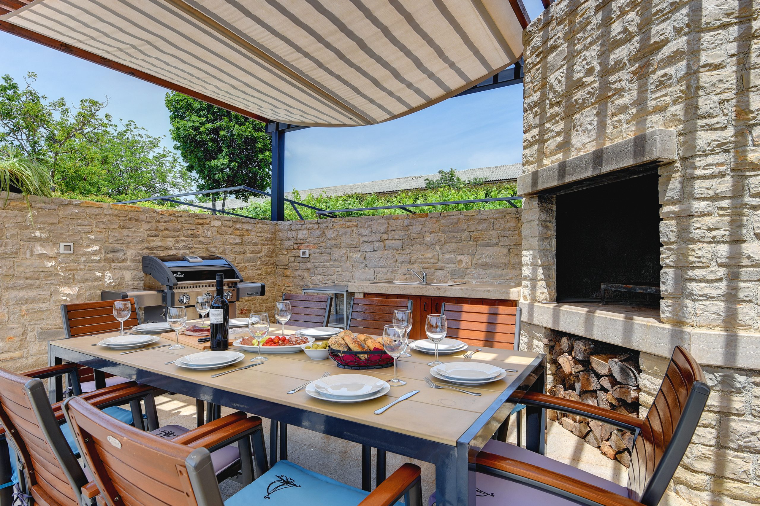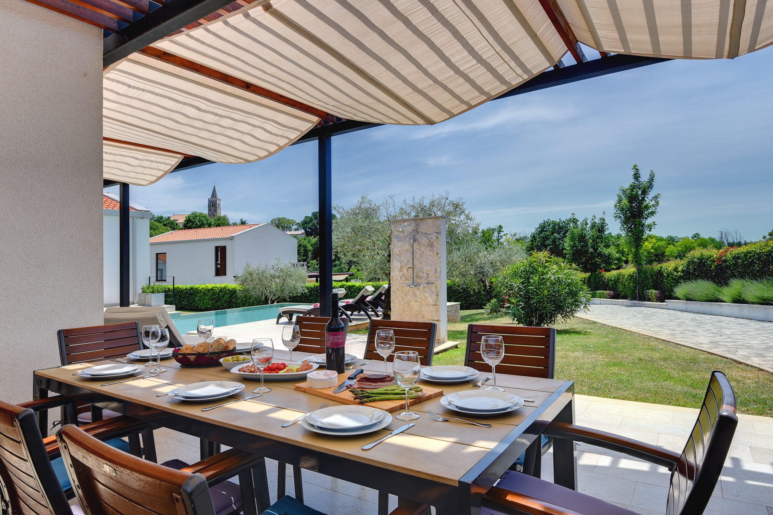 The beautiful and large Infinity pool, surrounded by a big charming green lawn, offers a perfect escape from stress. Here you can relax, swim, sunbath and enjoy your holiday. Prepare delicious meals for your family or friends on the outdoor gas grill or on the coals and dine outside in an al-fresco dining area. At your disposal are a beautiful and spacious living room, a kitchen and 3 bedrooms with en suite bathrooms. One of the bedrooms is connected to another bedroom with additional bed.